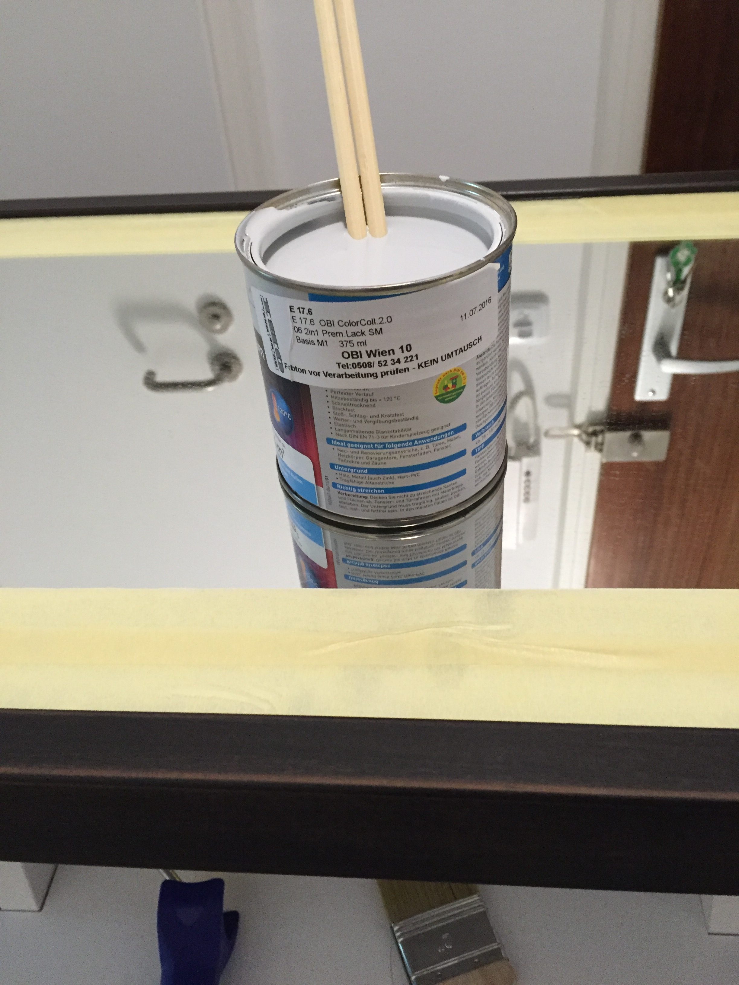 Den Spiegel habe ich abgeklebt, leicht mit Schleifpapier angeschliffen (mit der Maschine habe ich mich nicht dran getraut) und dann mit einer kleinen Lackrolle lackiert. Der Lack war super deckend und nach 2 Anstrichen ist vom alten schwarz braun nichts mehr zu sehen.